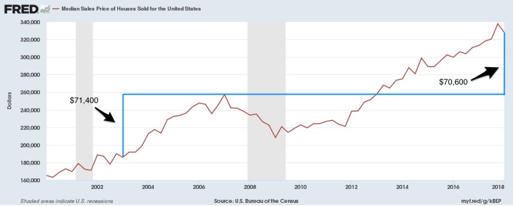 - In Q1/2007, the very height of the Bubble, the median sale price was $257,400. The difference between the two was $71,400 — meaning that the median house in the U.S. cost that much more in 2007 than it did in 2003.